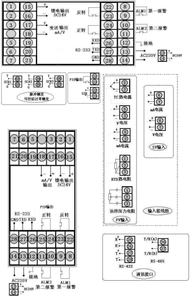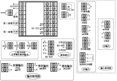 外給定控制,通訊方式RS232,輸出方式繼電器輸出,PV輸入類型為Pt100,SV輸入類型為4~20 mA,D一報警為上限報警,D二報警為下限報警,DC24V饋電輸出,供電方式為直流24V供電。
