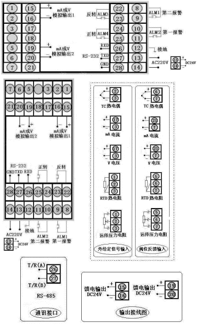 通訊方式RS485,輸出方式為繼電器輸出,PV輸入類型為4~20 mA,SV輸入類型為4~20 mA,D一報警為下限報警,D二報警為上限報警,DC24V饋電輸出,DC24V供電。